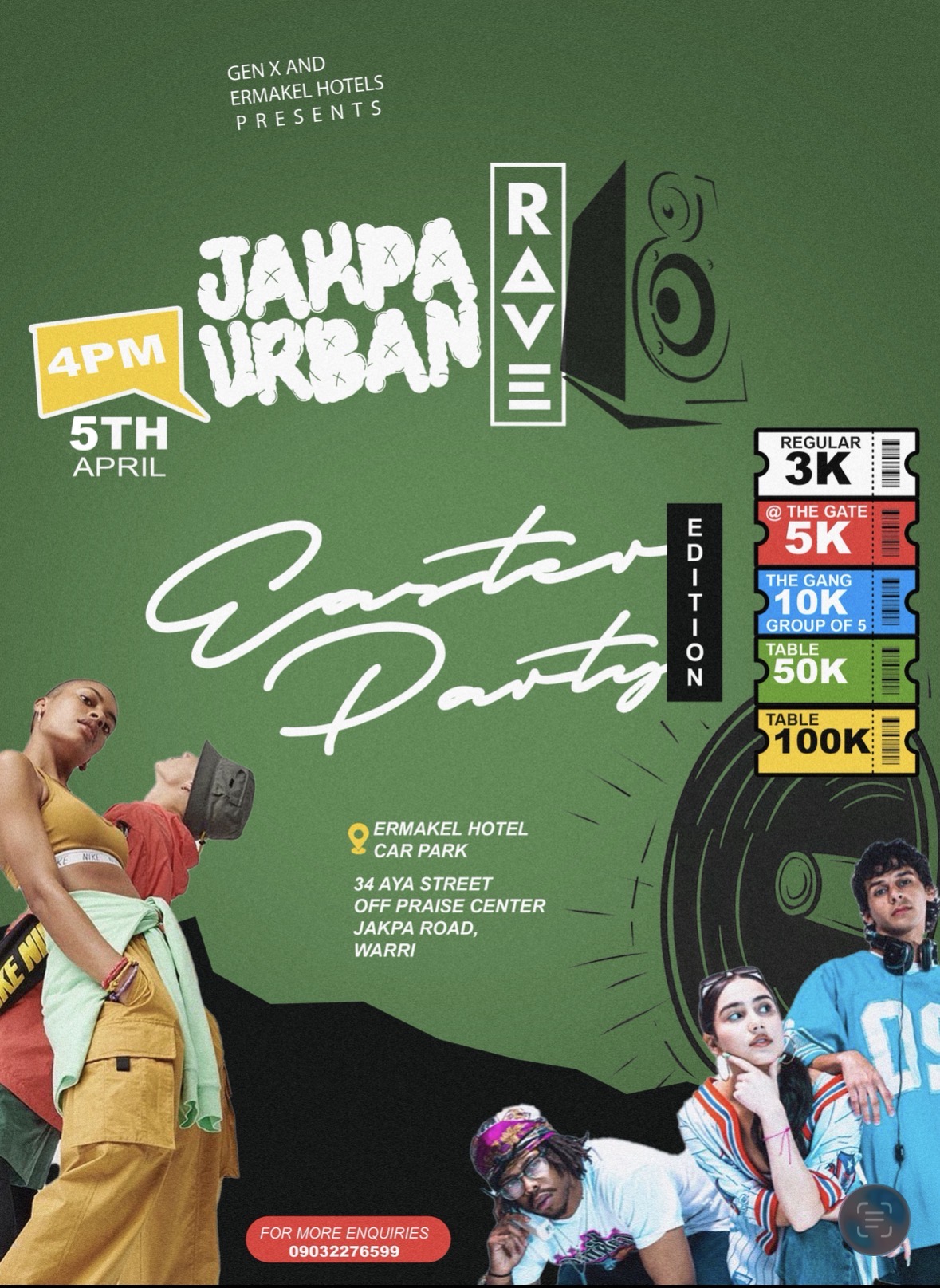 Get ready for an electrifying outdoor experience as Gen X and Ermakel Hotels bring you the Jakpa Urban Rave – Easter Party Edition! Happening on April 5th by 4PM at Ermakel Hotel Car Park, Jakpa Road, Warri, this event is set to deliver nonstop music, high-energy vibes, and an unforgettable urban party atmosphere.