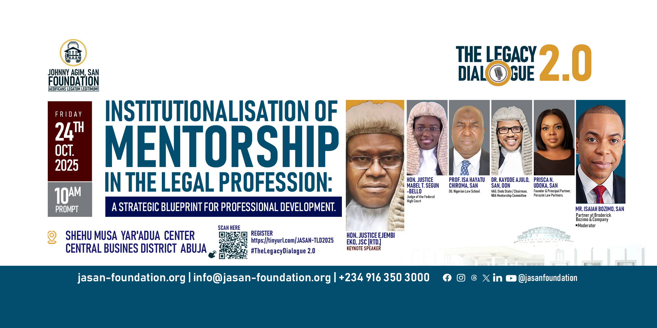 The Johnny Agim, SAN Foundation [JASAN Foundation] is pleased to invite you to #TheLegacyDialogue 2.0, the second edition of JASAN Foundation’s annual flagship strategic think-tank to drive legal and judicial reform and advocacy in Nigeria.